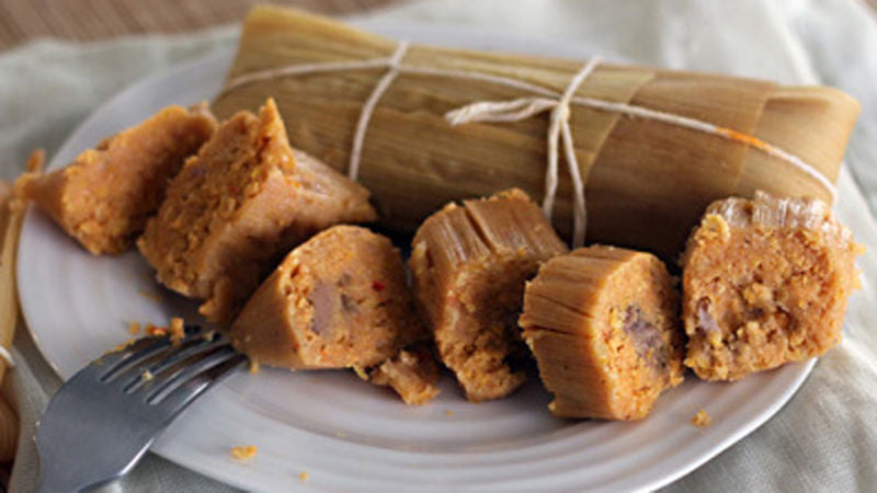 Slice the corn kernels off the cob (or use frozen corn). Quickly grind the corn in a food processor with your choice of fat (lard, or butter, or shortening) until you get a very coarse mixture with visible corn kernels. Don’t over process! Remove from the processor and blend in 2 1/2 cups warm chicken broth and two cups masa harina to the ground corn. Add a dash of Bijol powder to give it a nice yellow color.